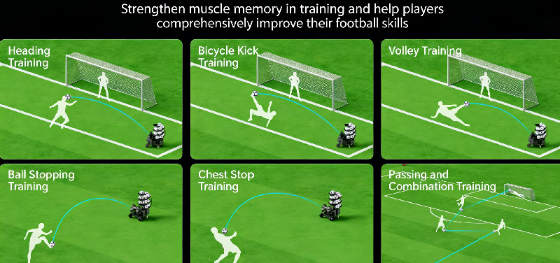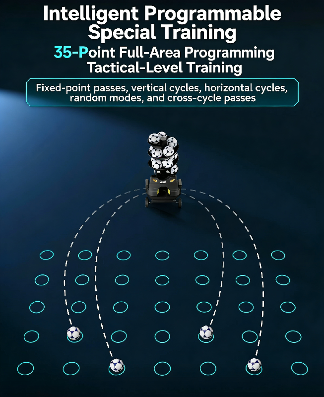 This high-performance equipment is equipped with a full-function multi-modal intelligent ball launching system, which not only allows free editing and combination of thousands of basic ball paths such as fixed-point balls, forward and backward balls, spinning balls, and random balls, but also realizes the industry’s first precise curved ball simulation technology. It can perfectly replicate core curved ball paths in actual combat such as banana balls, knuckle balls, and dipping balls. Whether it’s set-piece tactical drills, wing cross simulations, or long-range shooting power training, it can meet the diversified needs from basic skill polishing to high-intensity actual combat confrontation, making each training session highly consistent with the logical of actual competition scenarios.
