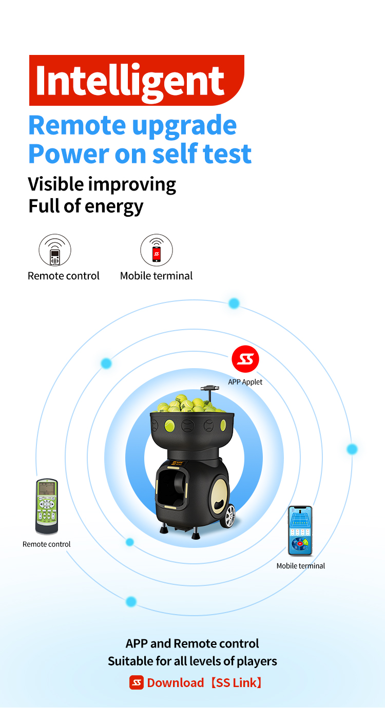 | Model: | SIBOASI T7 Tennis ball shooter machine | Control Type: | Both Mobile App Control & remote control |